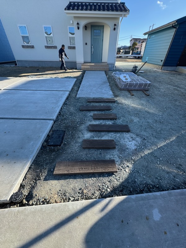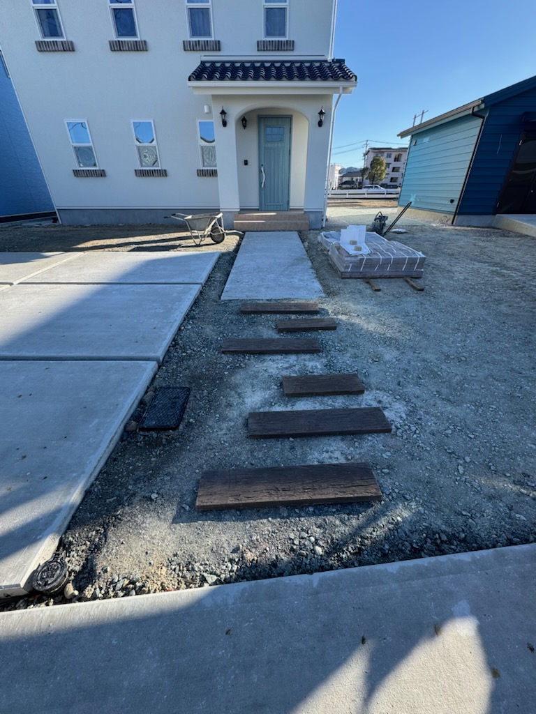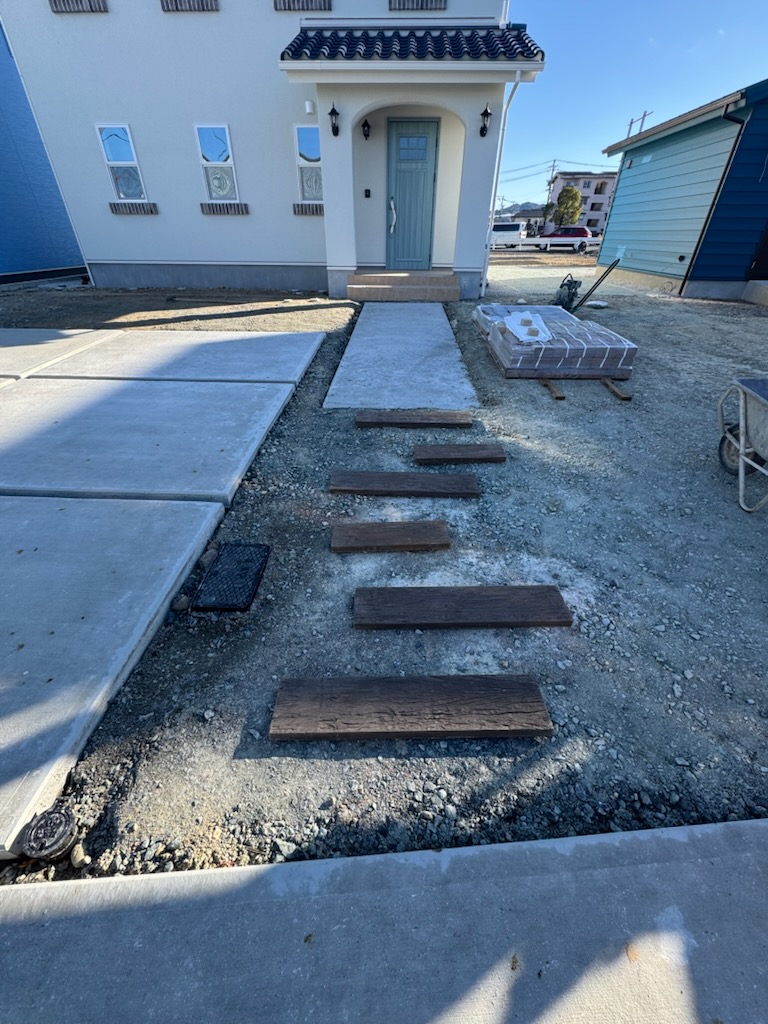 おちらのお宅では、玄関アプローチに枕木とレンガを施工します!