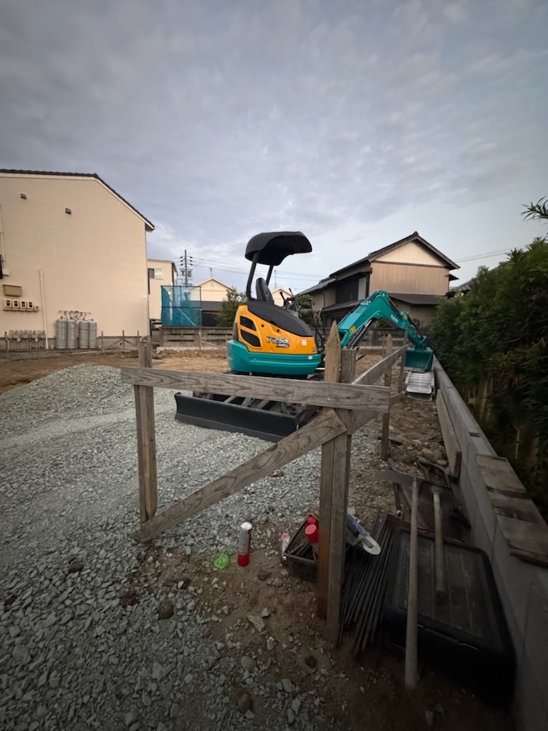 地面の掘削が行われて、駐車場部分に養生砕石が敷かれました。