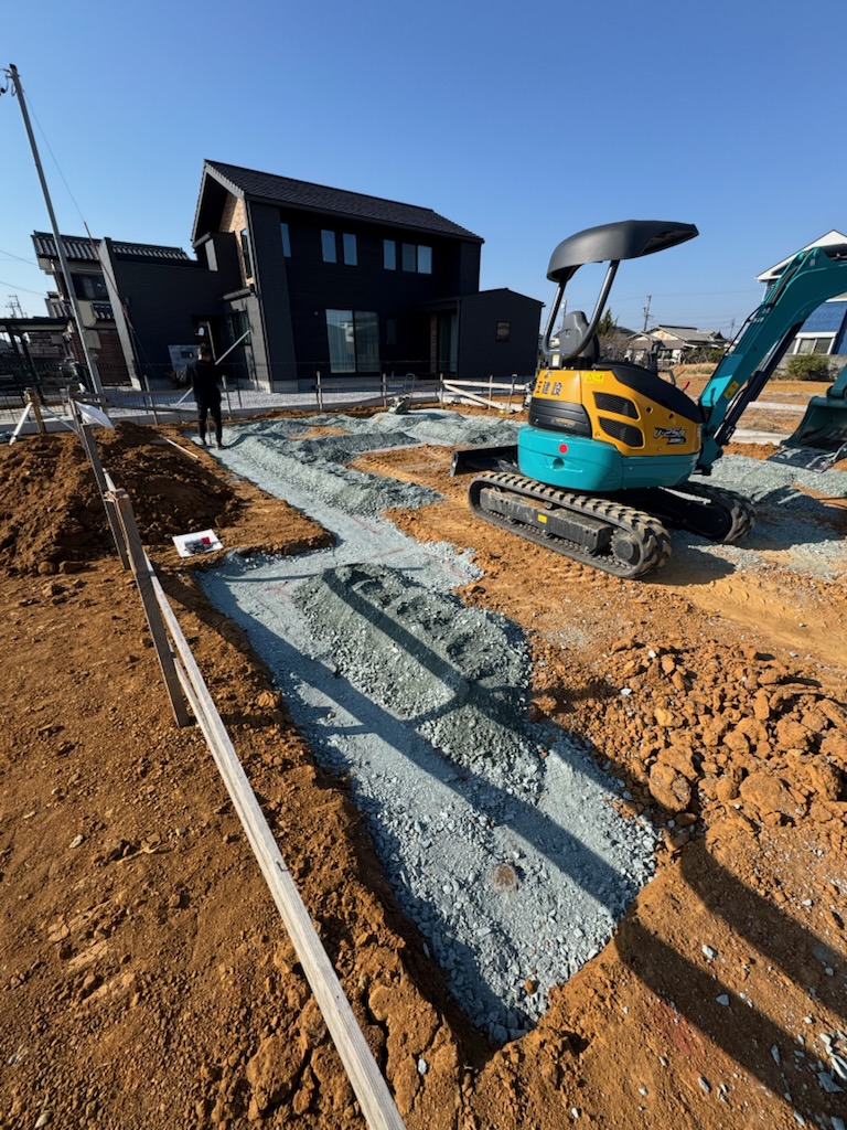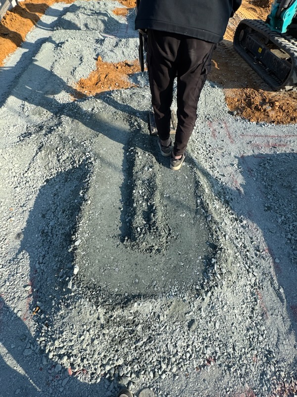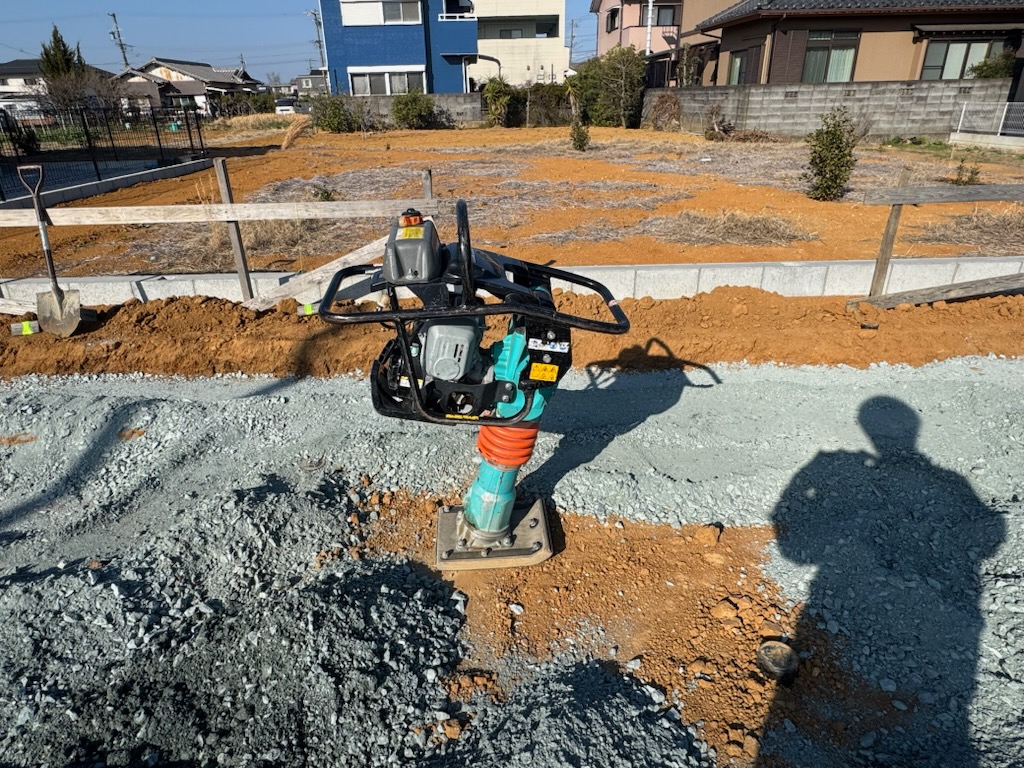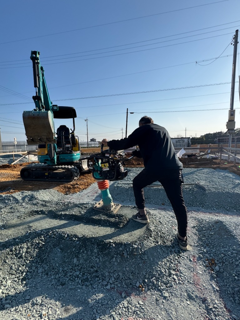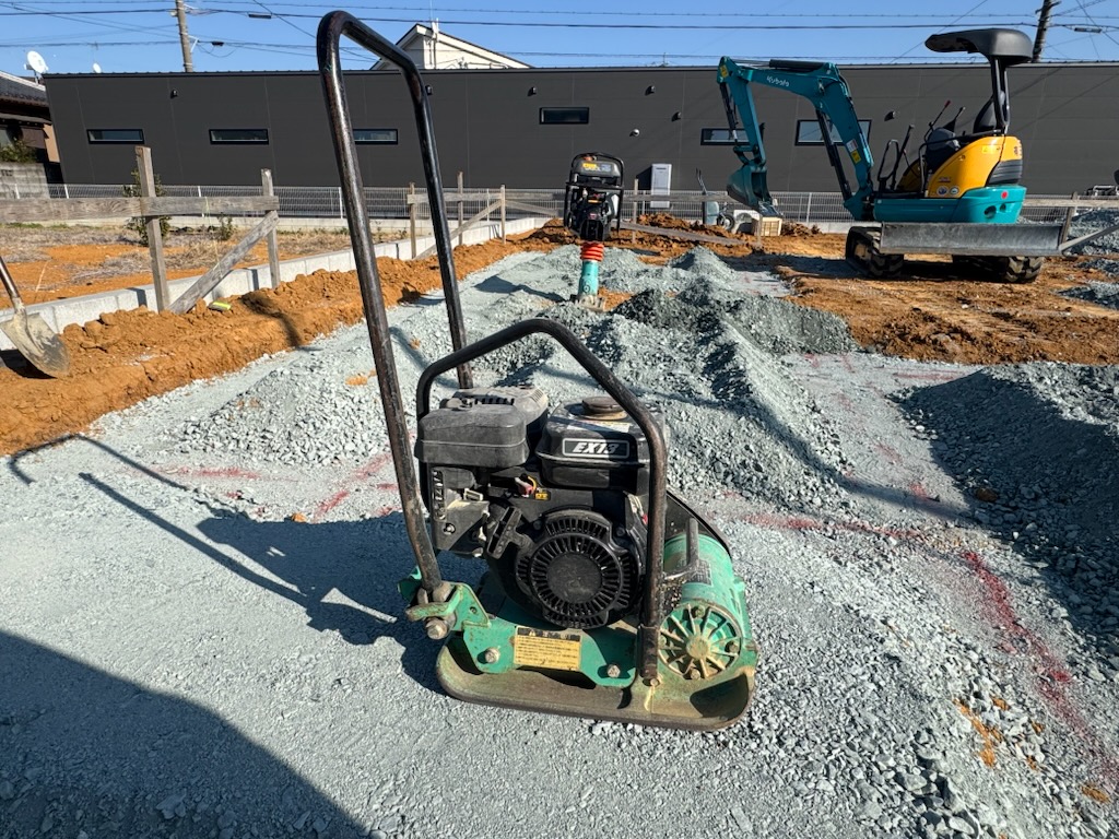 こちらは、基礎屋さんがジャンピングランマーで転圧をかけているところ。