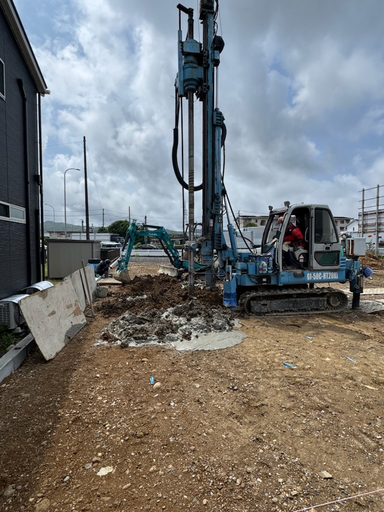 こちらのお宅、地盤改良がありまして…建柱機を使って地盤改良を行います。