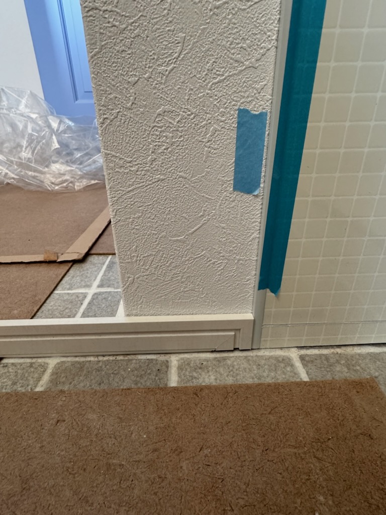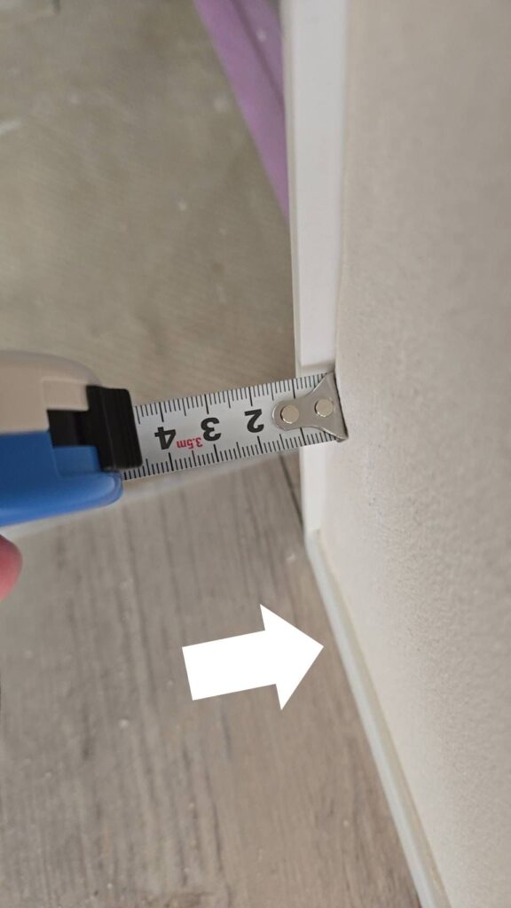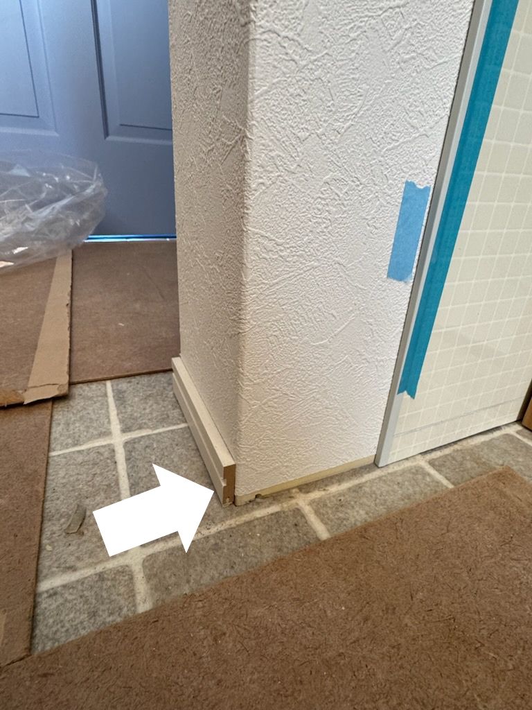 上の写真の白い矢印の巾木の切り口は、木ではないため塗装ができません。