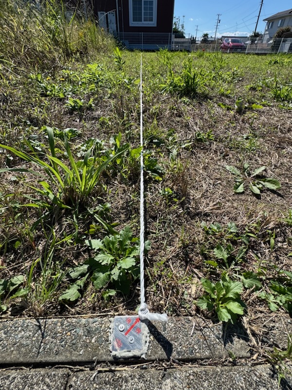 境界杭の角が境界だよっという印があり、そこから境界線を表わします。