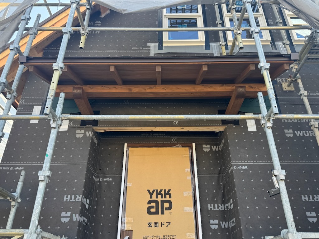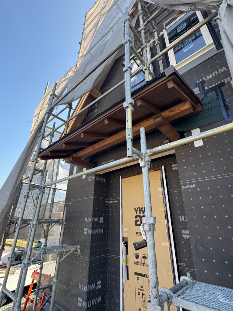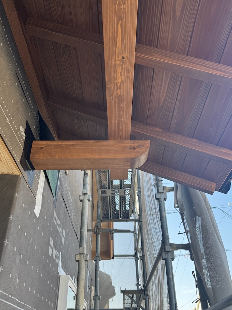 玄関の庇になる箇所を、あらかじめ加工と塗装をしておいたのでした!