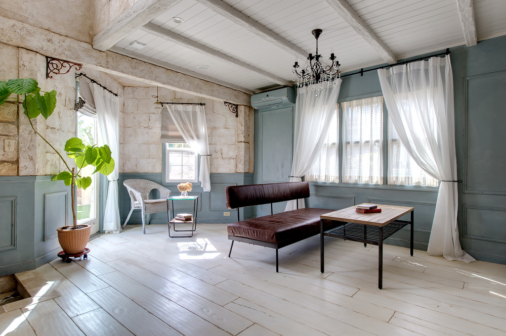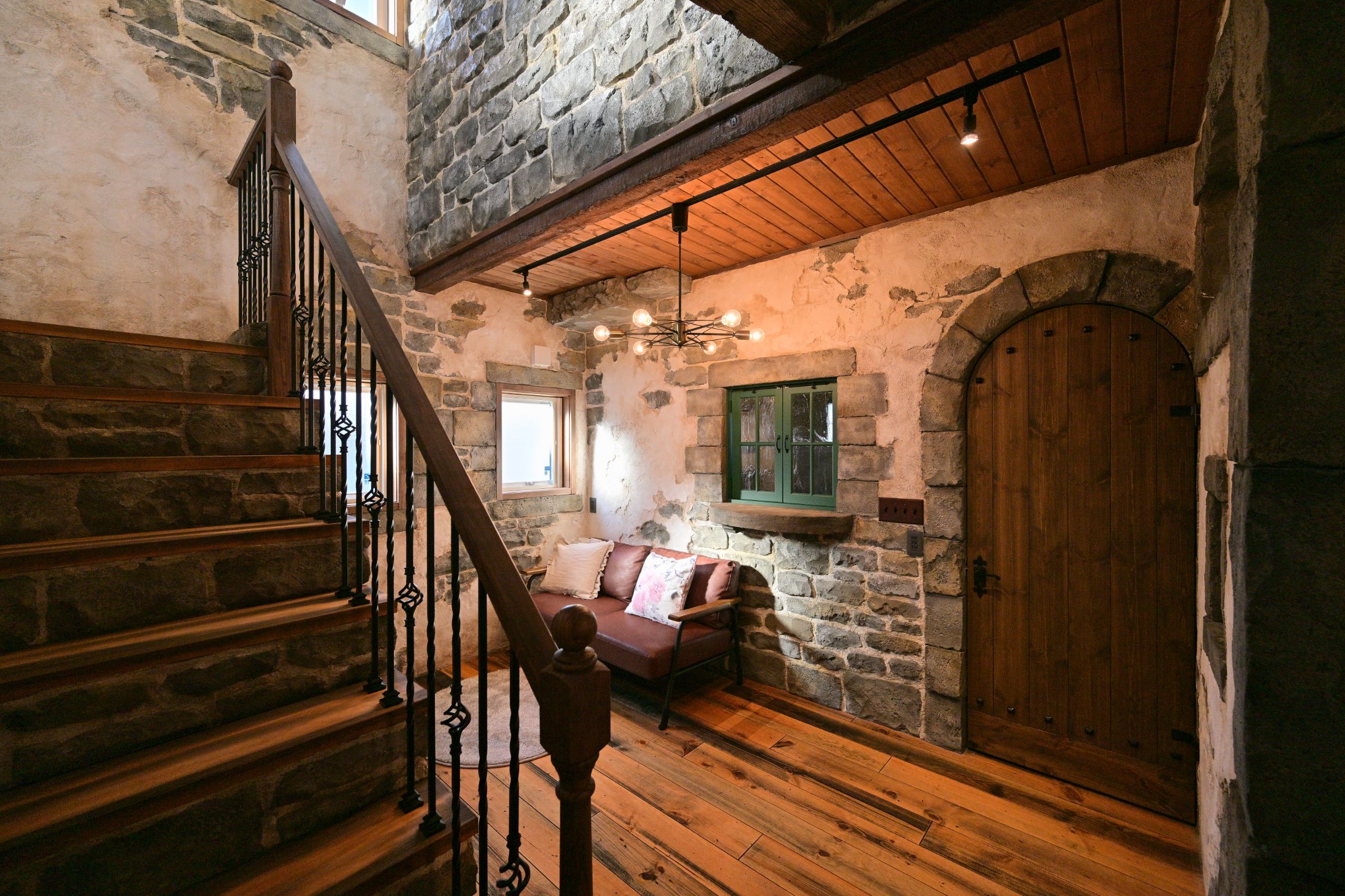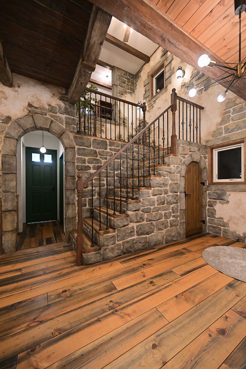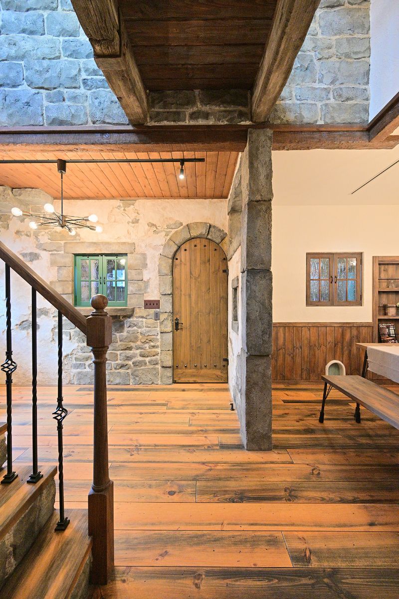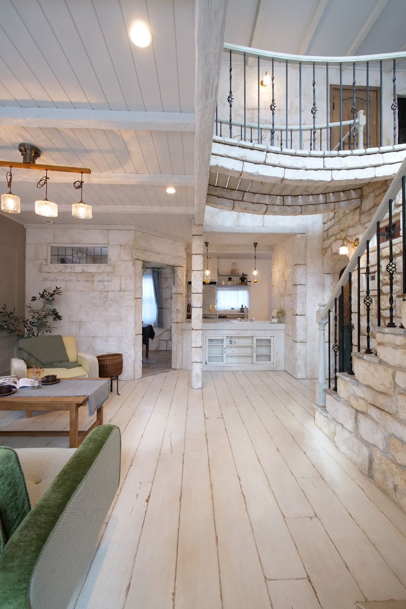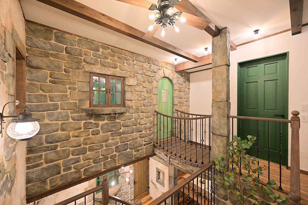 ヨーロッパの古城を思わせる石積みの外観、ゆるやかにカーブを描くらせん階段、ブルーグリーンやグレージュといったシャビーシックな色使い。