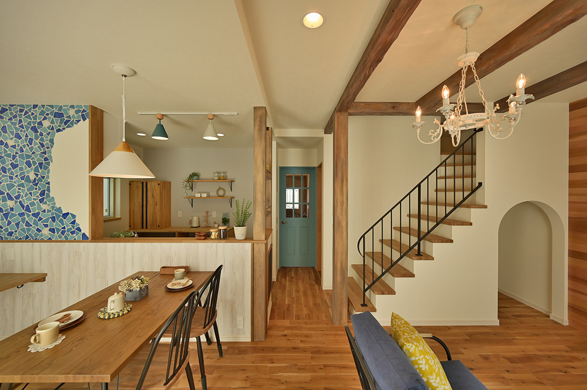 あめ色に変化する無垢の床、漆喰の壁にアイアンの手すりなど、さまざまな素材を使い分けて生まれた、大人かわいい「ママンの家」。